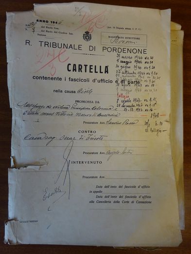 Camicia contenente il fascicolo d'ufficio riguardante la causa civile promossa nel 1946 dalla principessa Matilde Morpurgo de Nilma vedova Colonna e dal Vescovo di Concordia contro il ragionier Oscar Casa di Trieste (ASPn, Tribunale di Pordenone, Fascicoli civili, Anno 1946, n. 29)
