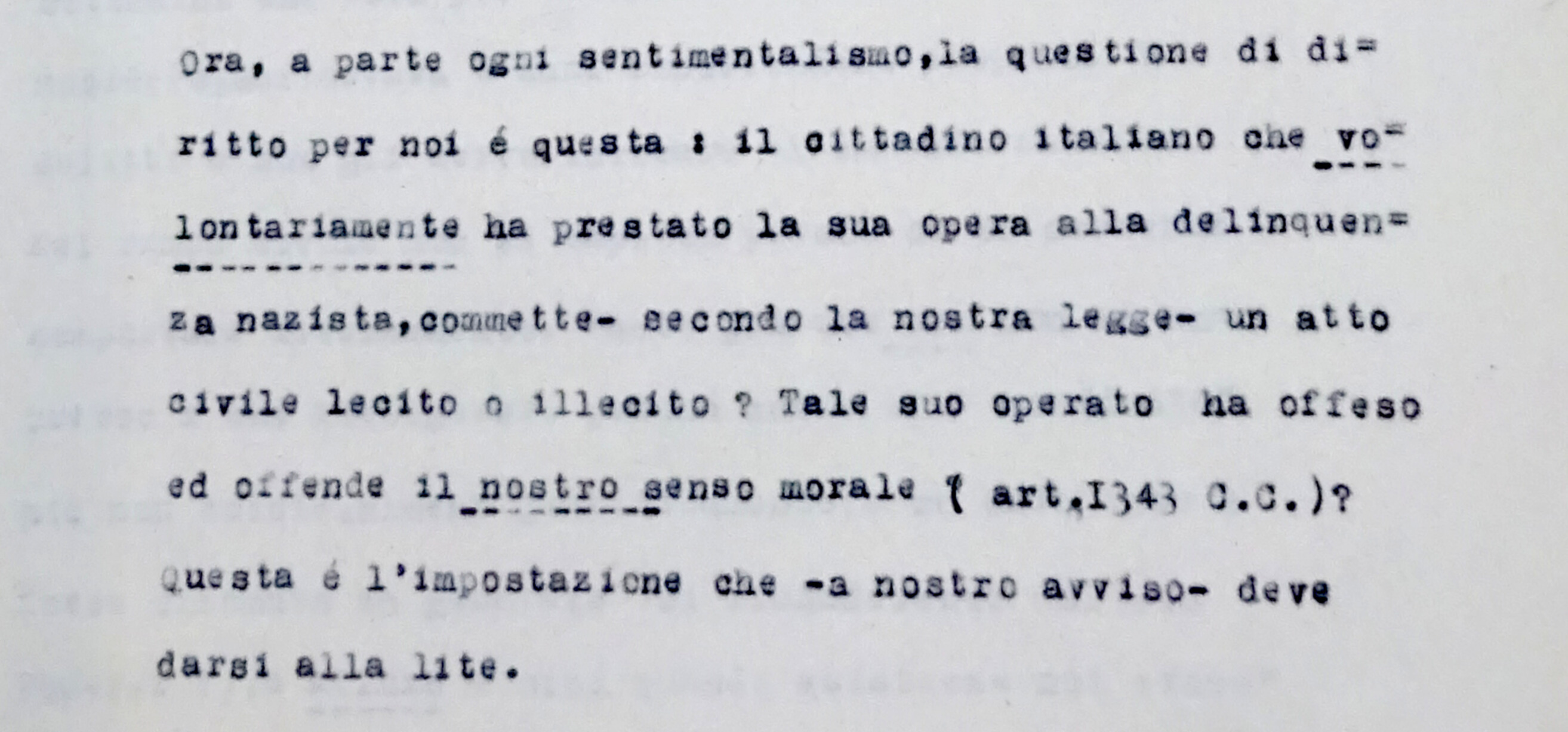 Quella che inizia come una causa civile per la rifusione di somme e la sottrazione dell'automobile «"Lancia" tipo Artena carrozzata fuori serie e tappezzata in cuoio» di proprietà della principessa Colonna, si trasforma però ben presto, nel dialogo serrato tra i procuratori degli attori e del convenuto, in una profonda riflessione sul tema della colpa di chi, anche in Italia, fece di più che limitarsi ad obbedire.